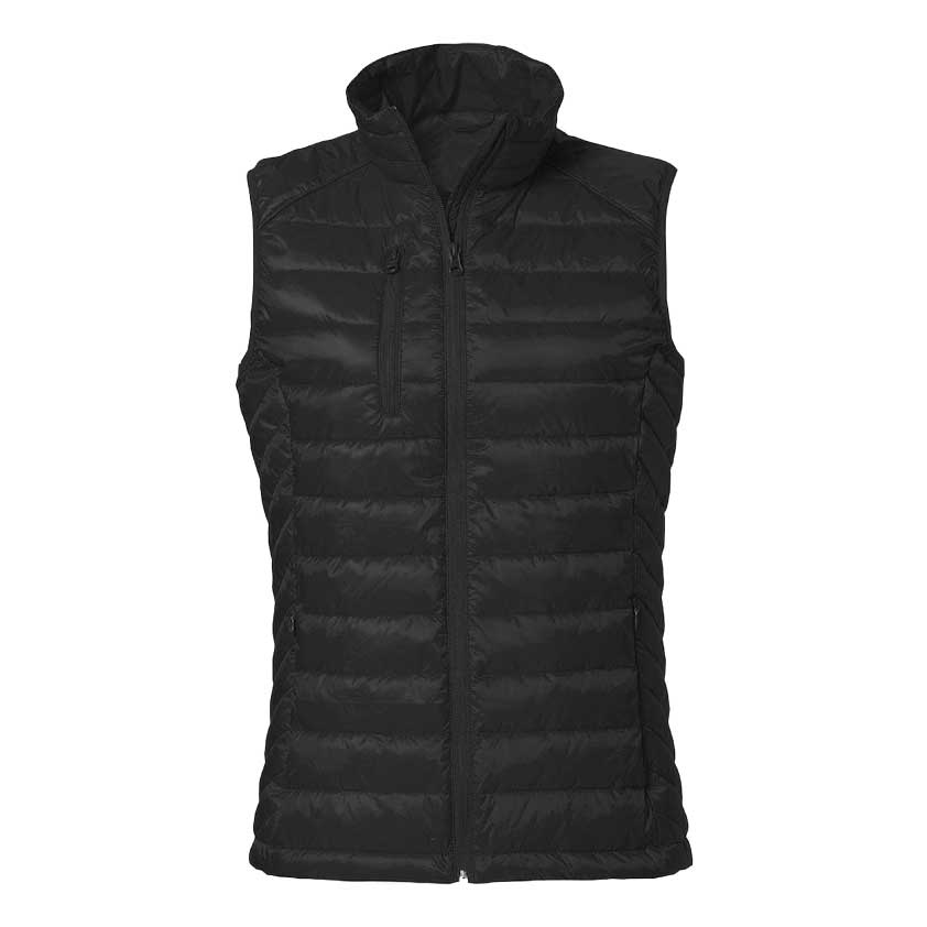Modern lättvadderad väst. Avtagbar huva och tre fickor med dragkedjor samt två innerfickor. Hörlursögla på insidan av halsöppningen.