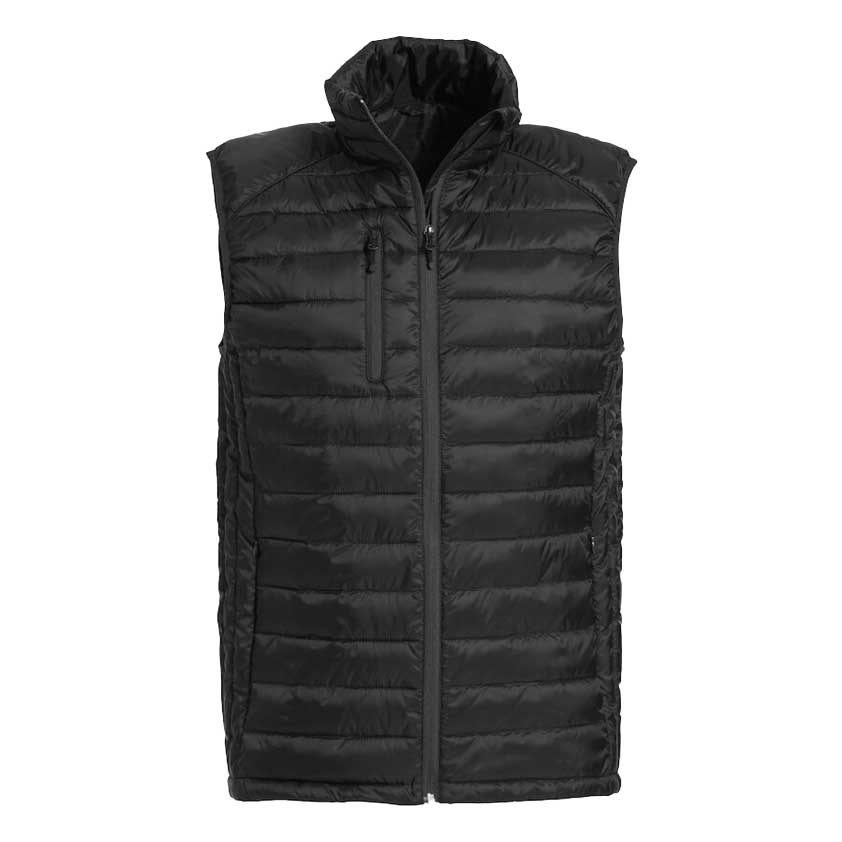 Modern lättvadderad väst. Avtagbar huva och tre fickor med dragkedjor samt två innerfickor. Hörlursögla på insidan av halsöppningen.