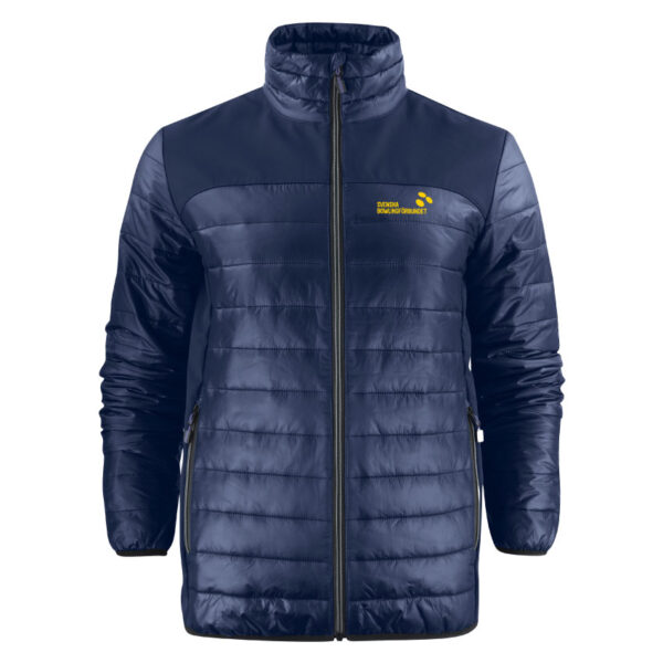 Softshell/lättviktsjacka med ok och sidopaneler i softshell (tyg 1). Bål och ärmar av vadderat, lättviktsmaterial (tyg 2). Blixtlås och zip pullers i Printer Essentials-manér.